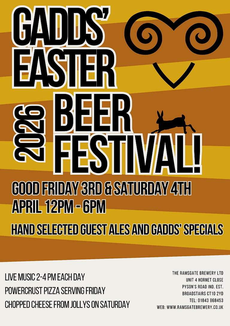 Ramsgate Brewery Easter Beer Festival 2026 Ramsgate Brewery, Broadstairs Friday 3 – Saturday 4 April 2026 Hand-selected guest ales and Gadds' specials; live music and food both days.